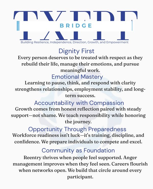 At TXFPF, we center our work on five core values that guide every reentry, anger management, and workforce development service we offer. We believe dignity comes first—every person deserves to stand tall as they rebuild their life. We pair accountability with compassion, because real change grows from honesty and support working together. We teach emotional mastery so individuals can navigate conflict with clarity and self-control. We open pathways to opportunity through preparedness, giving people the skills and confidence to step into meaningful work. And we build everything on community, knowing no one rises alone. These values shape how we walk beside every returning citizen, student, and job seeker as they move toward stability, purpose, and a future that lasts.